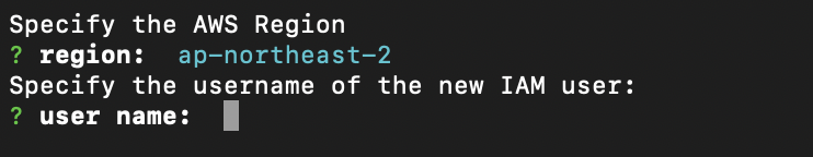 유저정보를 입력하고 엔터를 치면 aws console에서 IAM 유저를 생성하도록 유도한다.