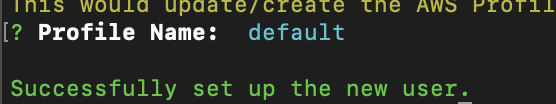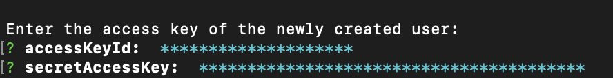 디폴트값으로 생성하고 생성된 유저의 accesskey와 secretkey를 터미널에서 입력한다.