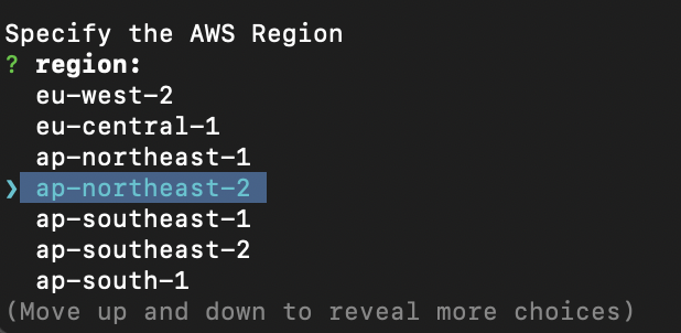 서울 region은 ap-northeast-2 이므로 선택, 키보드로 상하 이동 가능