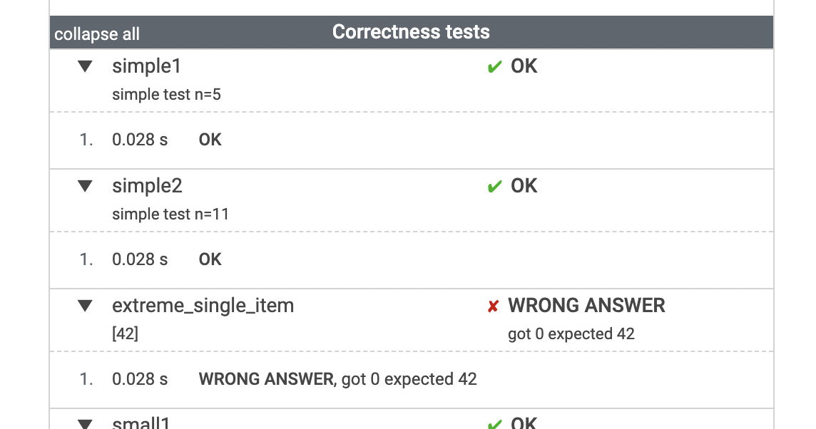 import Foundation import Glibc // you can write to stdout for debugging purposes, e.g. // print("this is a debug message") public func solution(_ A : inout [Int]) -> Int { // write your code in Swift 4.2.1 (Linux) var resultValue = 0 let list = A.sorted() for index in stride(from: 0, to: list.count - 1, by: 2) { if list[index] != list[index + 1] { resultValue = list[index] break } if index == list.count - 3 { resultValue = list[list.count - 1] } } return resultValue }결과